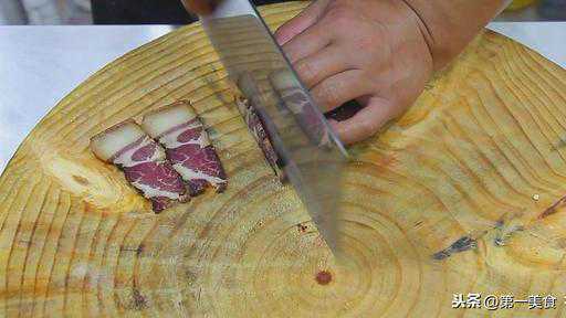 腊肉切成薄片放在盆里。