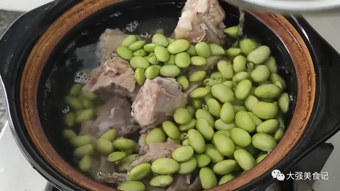 洗干净的排骨冷水下锅,加入适量料酒,水煮开后捞出来,再把排骨转到砂锅里,加入新鲜的黄豆,也叫毛豆,再加满水,盖上锅盖,先煮开,
