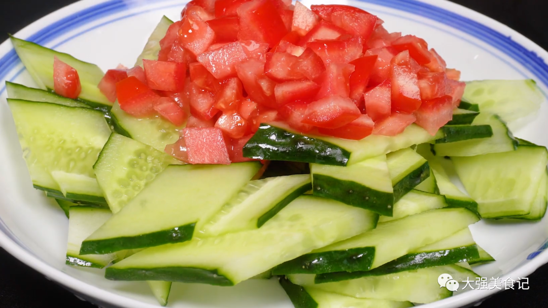一根新鲜的黄瓜,切掉头尾后斜着刀切成黄瓜块,再把黄瓜立起来切成菱形片。全部切好之后装入盘中,西红柿,先给它切成稍微厚一点的片,切成丁状大小一样,个个都成颗粒状,切好之后和黄瓜装在一起。