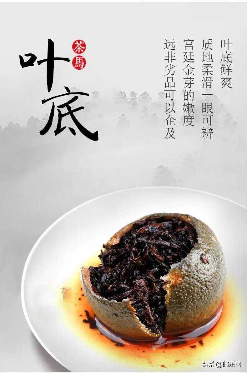 未成熟的新会柑果,经手工取果肉、清洗、晾晒干燥后,再将云南8年的宫廷级勐海普洱熟茶填入青柑果中,碰撞成形式新颖的茶品、滋味甘润、陈香四溢。