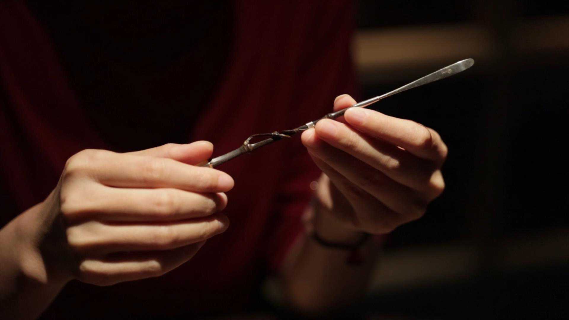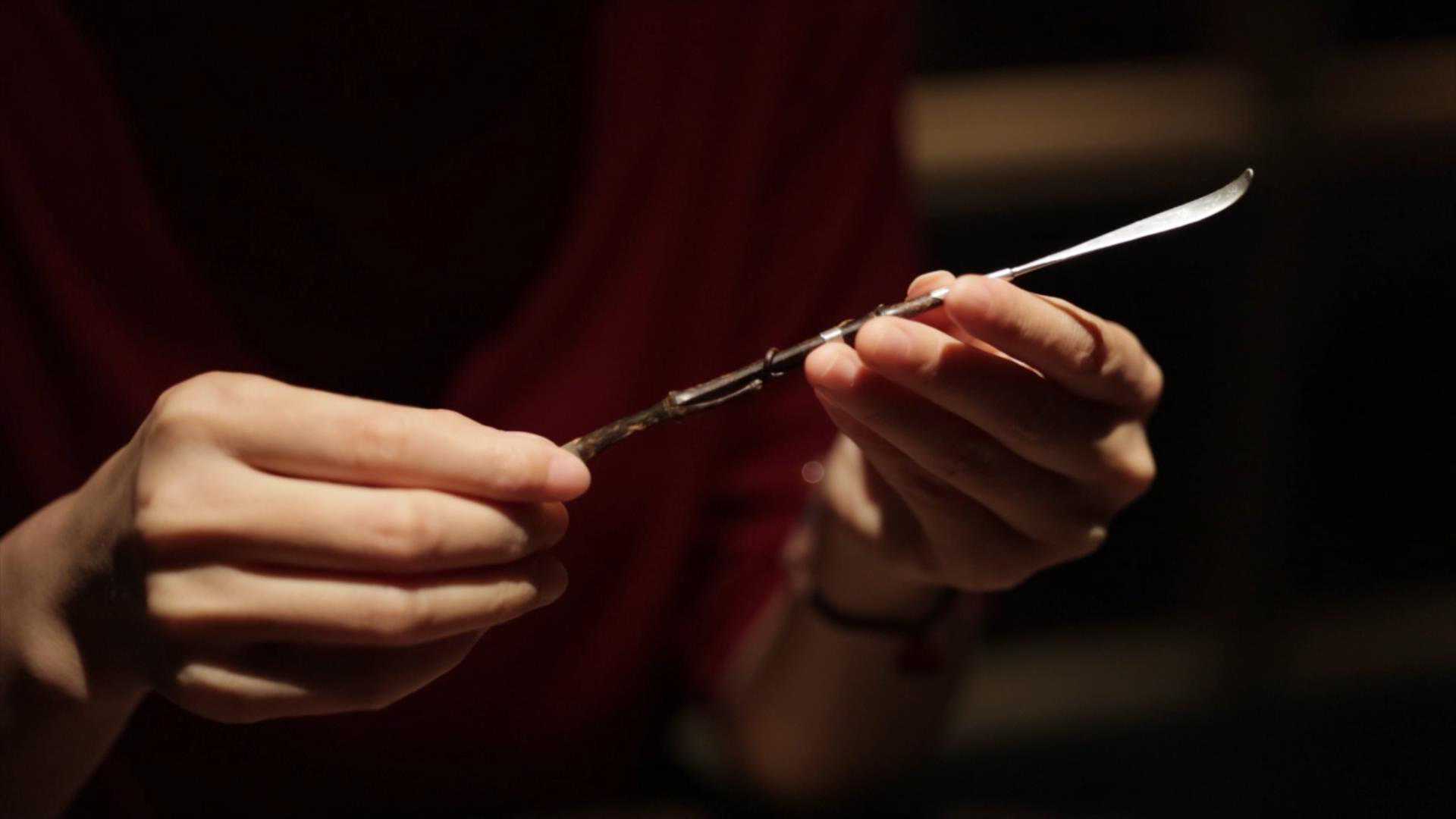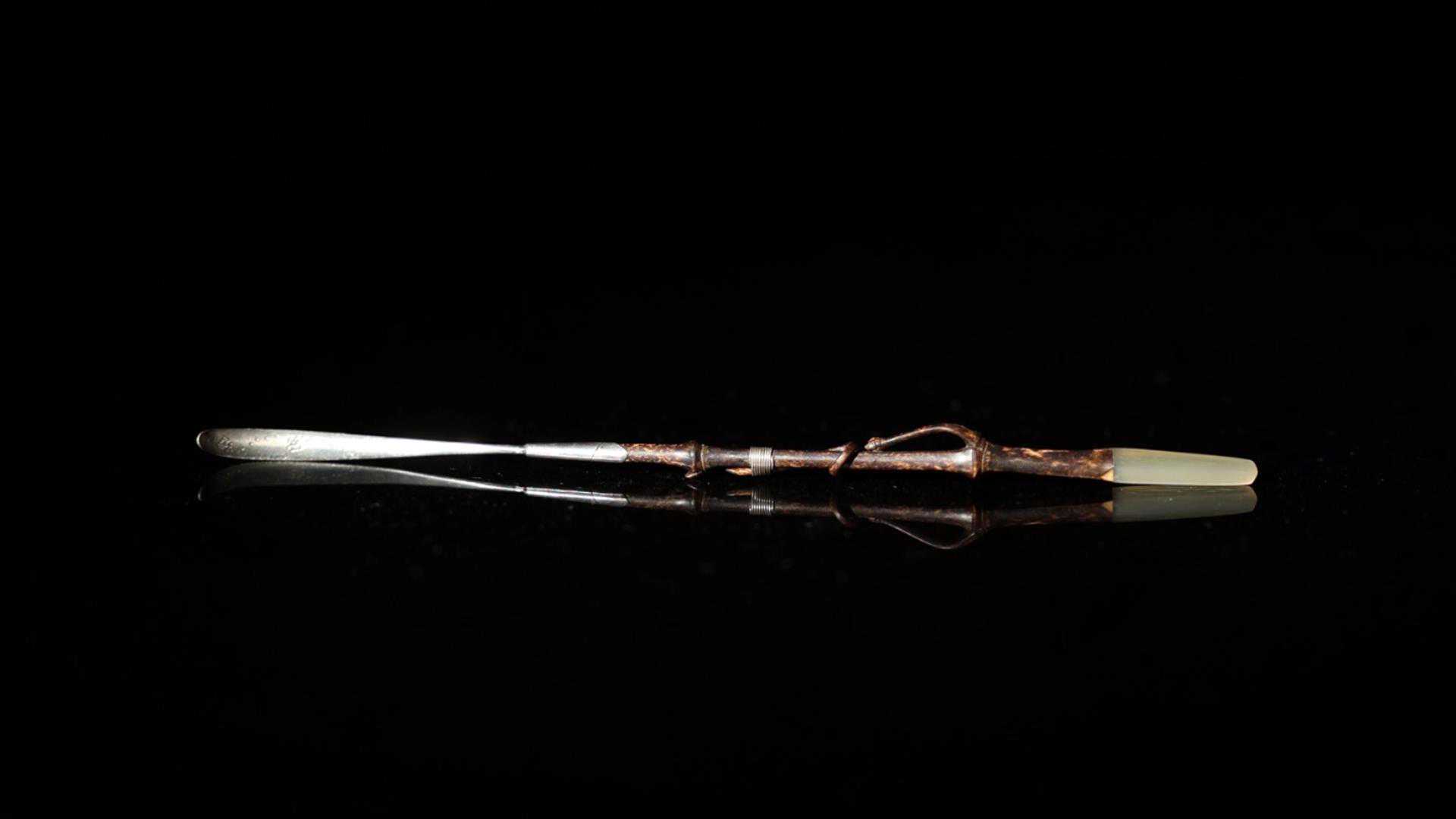 这个茶拨整个竹竿就是以竹子为基调的,然后茶拨的头是手打的银器,尾部是牛角做的。整个器型,它的线条把控还是非常流畅的。