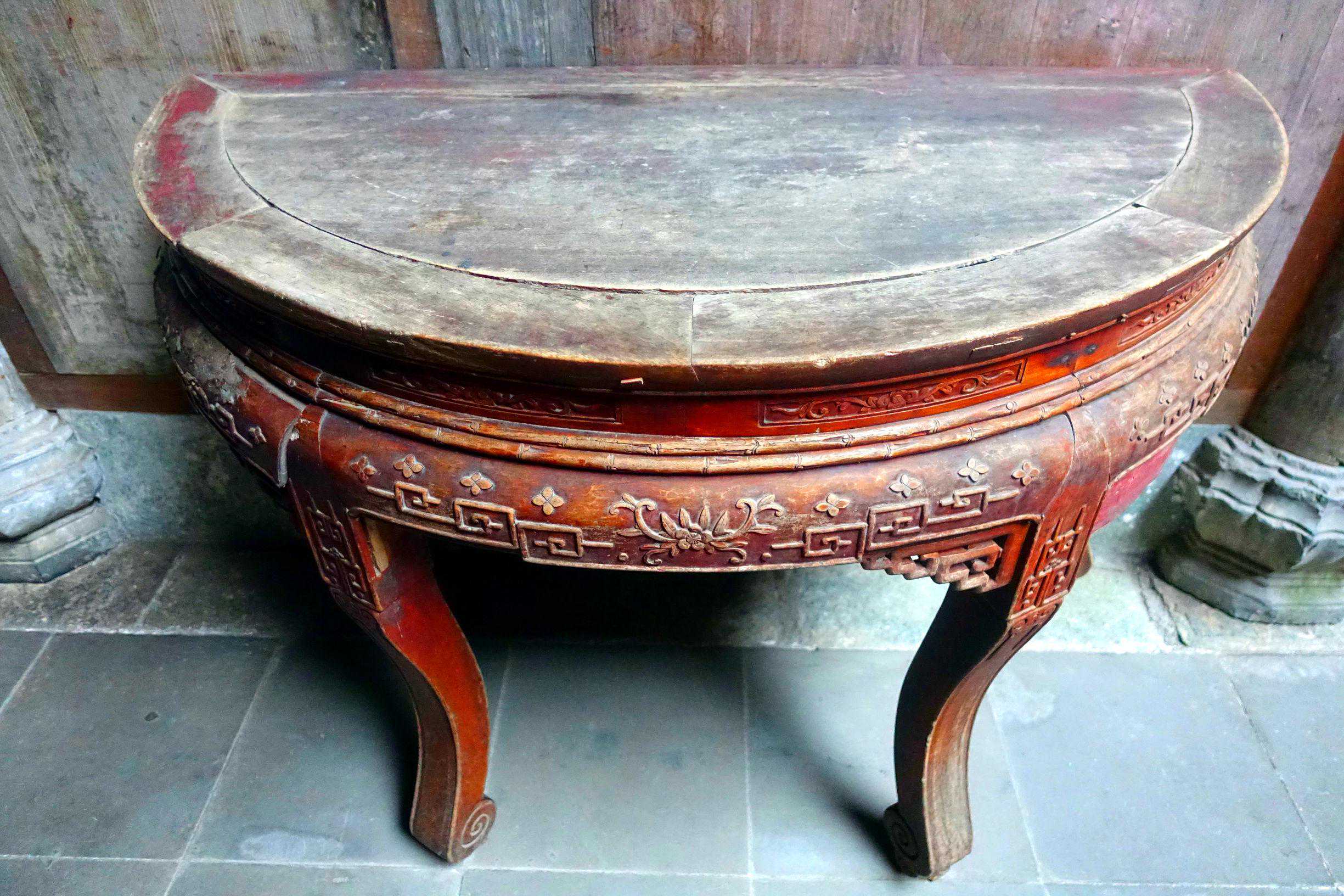 ▲合欢桌:两个半圆的桌子。因徽州男人常年在外经商,如果家中的合欢桌分开摆在厅堂两侧则寓意该户人家的老爷不在家;如果合并在一起就意味着一家团圆。