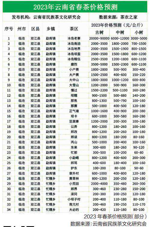 云南省民族茶文化研究会联合云南临沧、普洱、西双版纳、德宏、保山、红河、大理、文山、玉溪、楚雄10个州市相关机构,包含45个区县227个乡镇、666个村寨的茶农,共同发布《云南省2023年春茶预报价》。