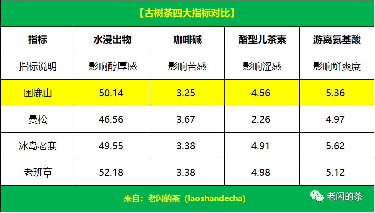 64马叭寨古树茶:易武天门山的产地,紧邻老挝的瑶族寨子。浸出物50.24、咖啡碱3.18、儿茶素4.85、氨基酸5.32。