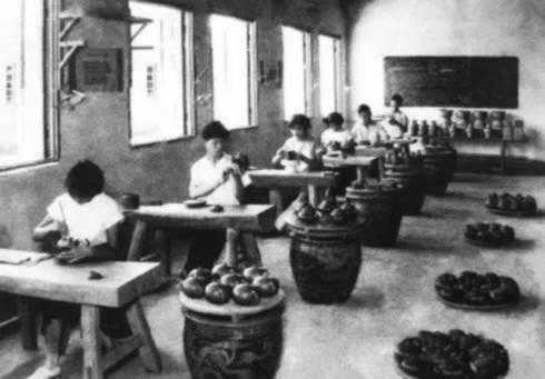 同年12月,31家窑户与36名工人组建紫砂工场,烧窑11次,产量44万件,产值5.9万元。1955-1956年,蜀山、前墅一带的紫砂从业人员组建宜兴县蜀山陶业生产合作社,主要生产出口茶壶,1956年产量90万件(其中出口28.2万件),总产值55万元。该社还设立“紫砂工艺班”,招收艺徒61人,江苏省人民政府任命任淦庭、朱可心、裴石民、王寅春、吴云根、顾景舟、蒋蓉为技术辅导。1958年4月,蜀山陶业生产合作社、宜兴合新陶瓷厂与上袁、潜洛28家紫砂手工业户合并建立“宜兴紫砂工艺厂”,有职工2067名,其中艺徒299名。1959年还成立宜兴西氿紫砂工艺厂,可惜于1961年停产。