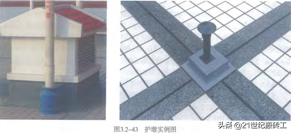 7.2.4工艺方法∶管道及支架根部可做成六边形护墩,尺寸及形状见图3.2-44、图3.2-45,图中尺寸仅供参考。管道及支架根部应作找平层且应居护墩中心。混凝土护墩基体浇筑后粘贴饰面砖,饰面砖拼接缝应倒角,拼接严密。在护墩顶面可贴面砖或砂浆面嵌铜条,位置与多边形角部连通,向外10%找坡,水泥砂浆顶面应密实平整,收压抹光。石材护墩石材应统一加工,阳角处倒角拼接。采用云石胶粘贴固定,石材平面压立面;护墩与管道、屋面及护嫩错台处应打胶密封。同规格、同排、同形式护墩宜成行成排、大小一致。