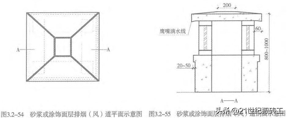 9.1.4工艺方法∶确定排烟(风)道尺寸、立面高度宜为0.8~1.0m,顶面坡度为10%。顶面应嵌分格条或铜条,选用铜条时,所有阳角及风帽顶面交接线均应镶嵌。顶板底面四周距外沿20~30mm处应设滴水槽,端部与墙面链接处设断水。铝合金百叶应居排烟(风)道中心∶,百叶周边应打胶封闭。排烟(风)道内部抹灰应抹压密实,表面平整,分格或铜条清晰顺直,必要时,面层可刷涂料饰面。