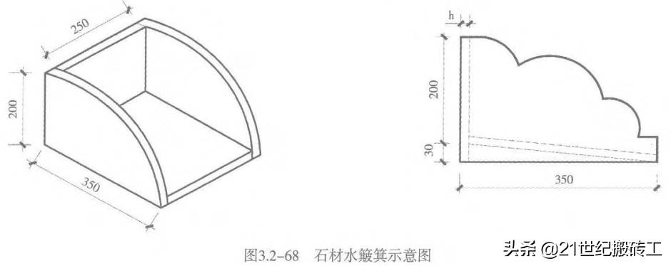 12.4工艺方法∶水簸箕选用石材或饰面砖制作。石材或饰面砖加工时,棱角应倒角,云石胶或粘结剂拼装,应与墙面结合严密,并与水落口中心对应,底部石材宜内高外底,与墙面及屋面交接处应打胶封闭。