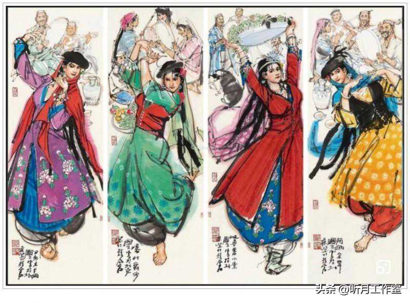 当代著名画家史国良《人物画四条屏》此作品中可以看出,扎实的绘画功底,有黄胄先生人物画的飘逸,画面中又有蒋兆和先生线条的笔墨,吸取各先生的精华,大胆创新,在人物画中开出一朵艳丽的花朵。