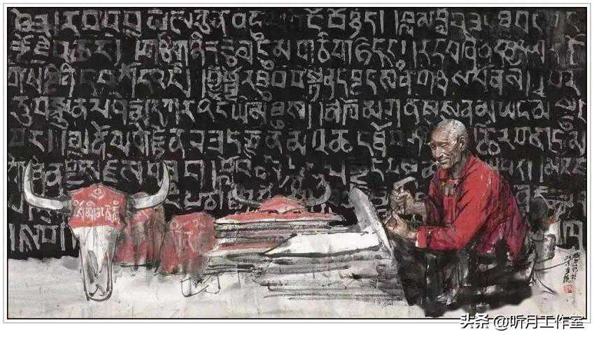 当代著名画家史国良《刻经图》这幅画的大背景是一块经过作者意念夸张放大的巨型黑色石板,上刻白色经文,显示出一种生命之外的深邃与庄严。在黑压压的背景之下,作者将宗教意义上的两种生命体的存在方式——活着的刻经人和两尊牛头骨——置于同等的审美架构上,分别披挂一层鲜红的外衣或刻有藏传佛教咒语“六字真言”的红布,近似西方印象派大师的做派,用主观色彩渲染出作者内心的沉重与希冀。史国良曾表述说,他创作《刻经》时,是想表现刻经人矢志不渝的虔诚,但更多人读到的却是宗教生命体的永恒与无奈。