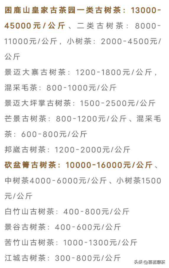 “2024年,老班章和冰岛老寨的江湖地位稳固,老班章古树茶毛料为12000—25000元/公斤,冰岛老寨古树茶毛料为22000—95000元/公斤;普洱茶区除了困鹿山皇家贡茶一骑绝尘外,后起之秀钉耙山等成为新贵,钉耙山古树茶毛料为26000—公斤……”