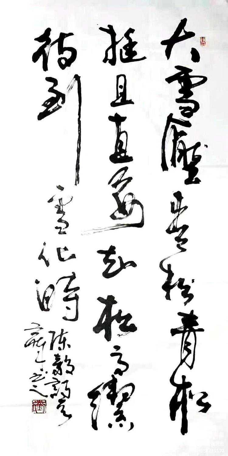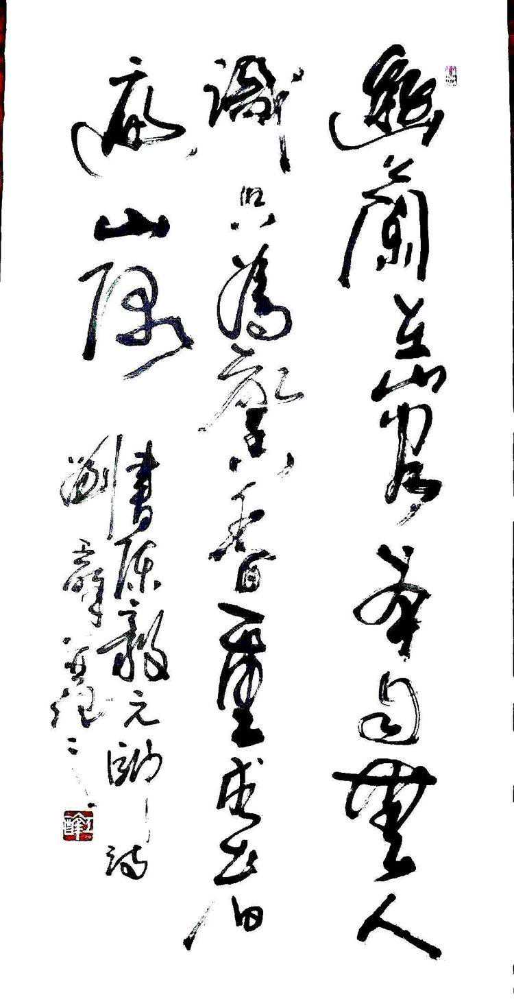 二、醉草。先生的草书,师从张旭、怀素、王铎、徐文长与八大山人几家,他善学会变,而不是描摹古人的影子。他本人多才多艺,涉猎艺术门类众多,具备惊人的悟性与创造力,从而形成与众不同的艺术风格与面貌。其草书用笔自然流畅,既娴熟高格又豪迈遒劲,给人一种大江东去的汹湧之势。观先生的草书作品,真是痛快淋漓,犹如飞流直下、马跃平川,张扬着狂放不羁的个性。懂得书法的人都知道,草书是书法的重中之重,擅长草书者历来少之又少,没有艺术修养和高深造诣的人,从来不敢问津。刘工醉先生乃当世奇才,集诗书画印与理论一身,其胸藏万卷书,下笔如有神助,创作出如此惊人之佳作,自在情理之中。
