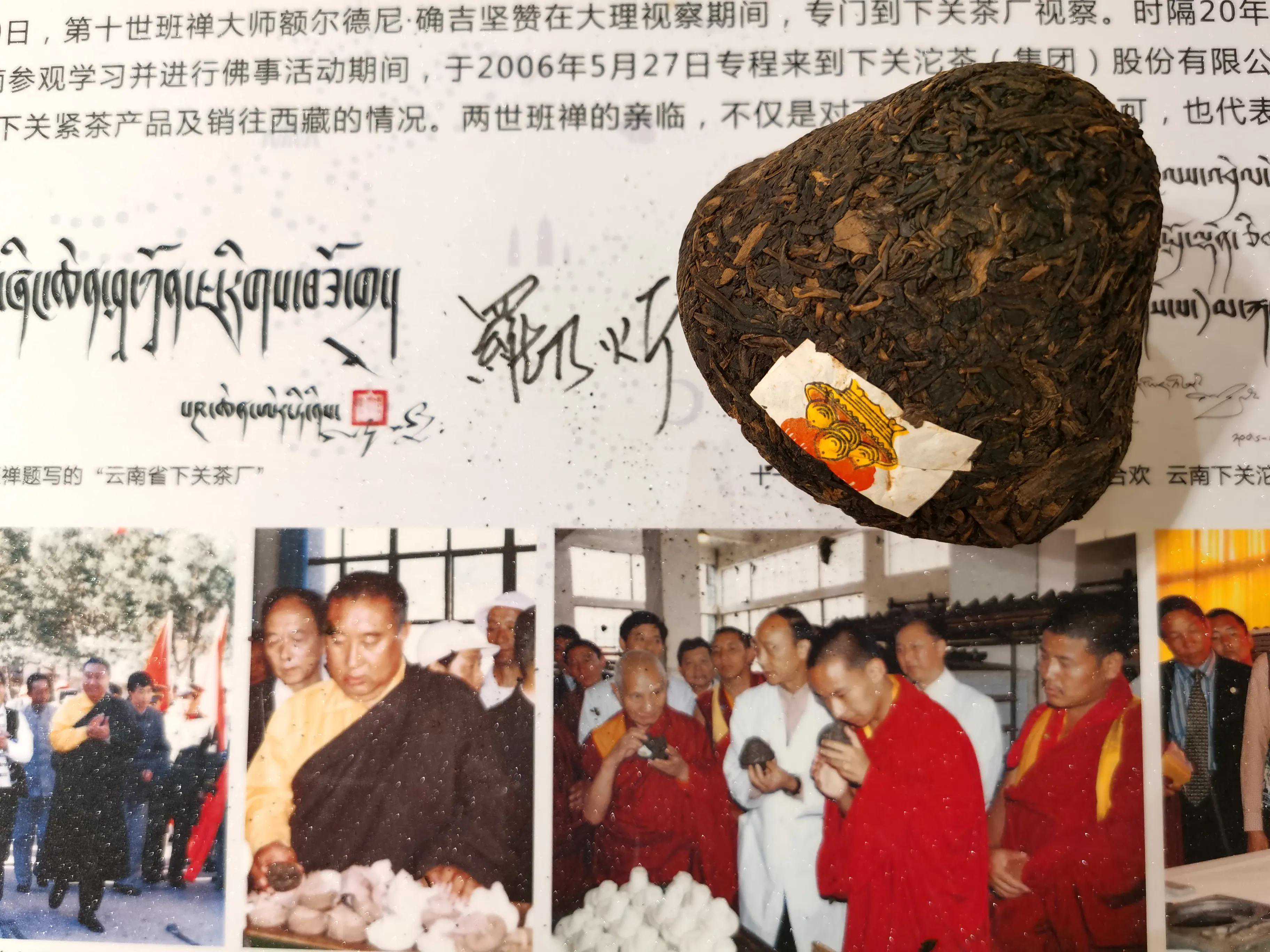 1986年10月20日,第十世班禅大师额尔德尼.确吉坚赞在大理视察时间,专门到下关茶厂视察,并在场向冯炎培厂长提出重新启动生产宝焰牌紧茶(牛心沱),历史上始于1941年民国时期的康藏茶厂(下关茶厂前身)的宝焰牌紧茶一直是藏区广大僧众的佛礼高端供茶,1966年12月,在文革破'四旧'运动中,宝焰牌商标带有封建主义色彩,商标上有一些宣传资本主义经营的词句应该更换,上报省茶叶公司研究后同意,停产'心脏型'紧茶改为'砖片型'边销茶(下关茶厂厂志P16),十世班禅大师提出复产宝焰牌紧茶是藏区广大僧众的热切期盼,当场订购500担紧茶通过青海政协入藏,此后,下关茶厂宝焰牌紧茶被后世称为“班禅紧茶”、“班禅沱茶”、“班禅礼茶”……一时间名声大噪,随着普洱茶收藏和拍卖的兴起,下关茶厂宝焰紧茶也成为爱茶人的心头好。