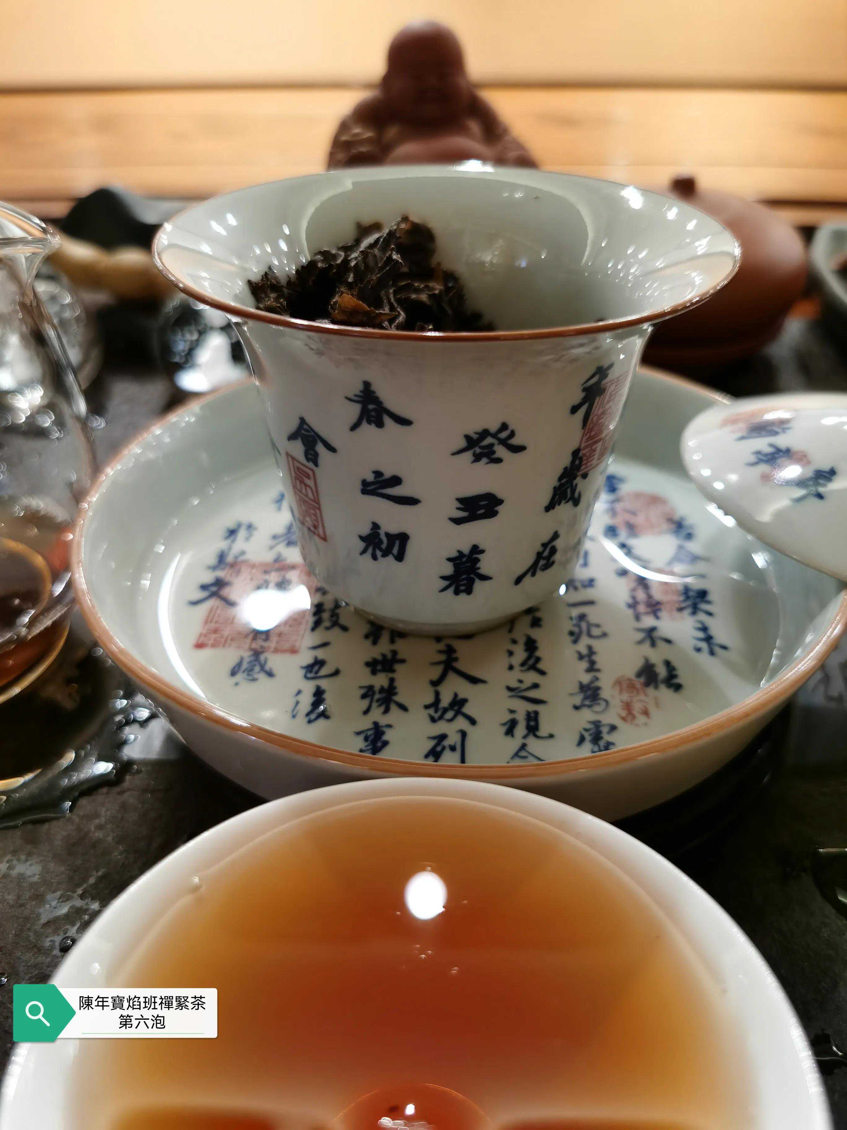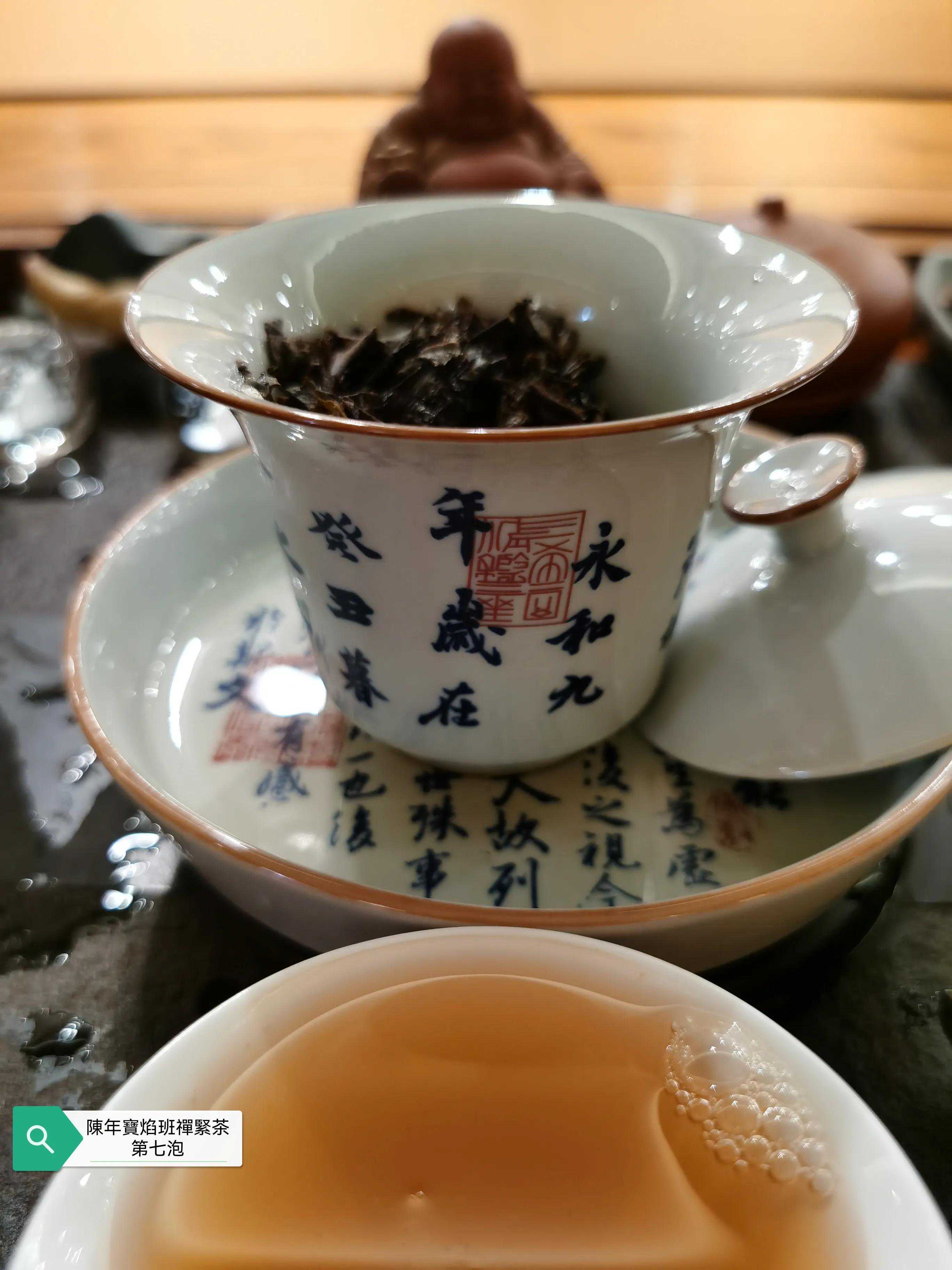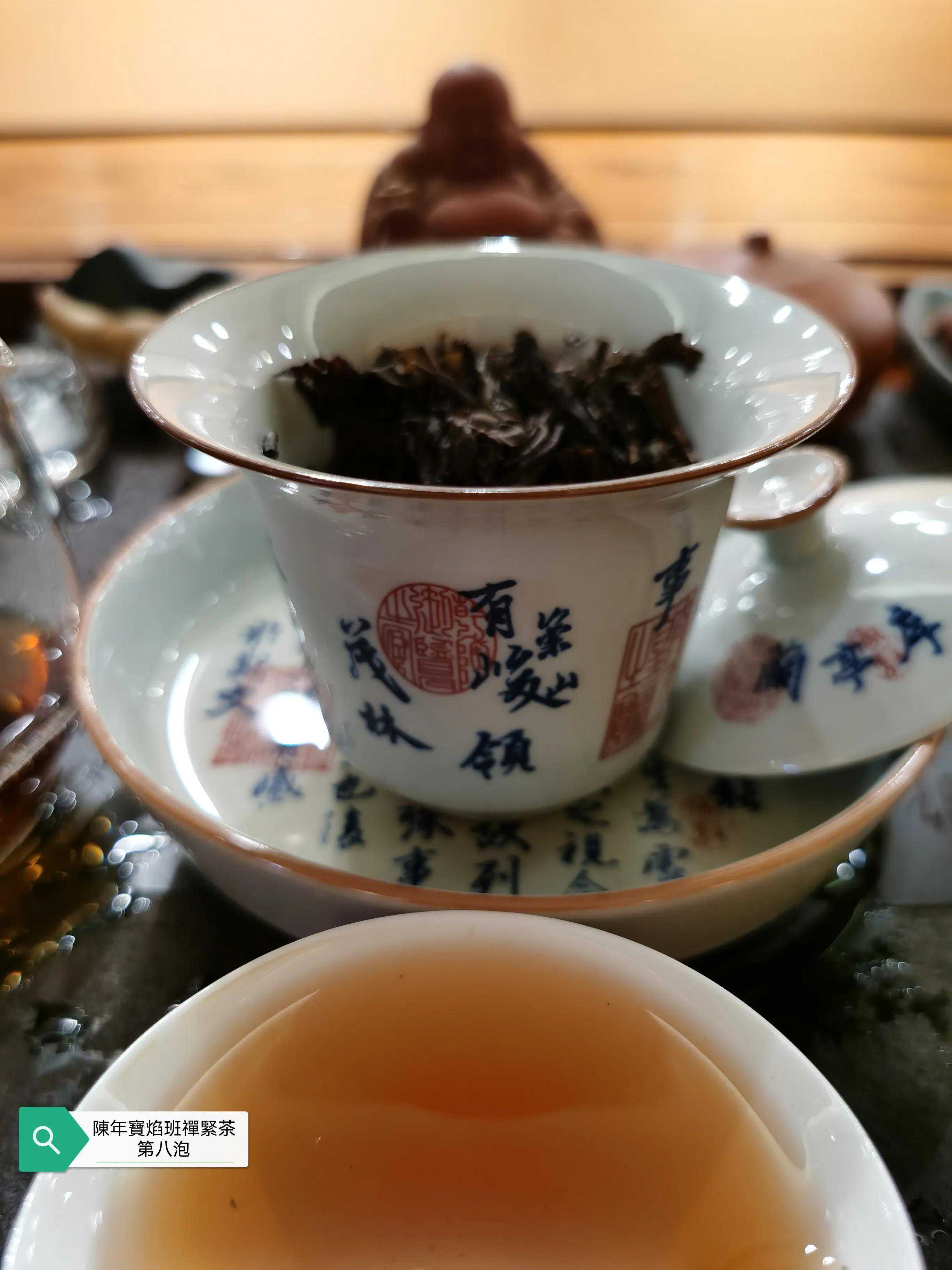 本次品鉴的班禅紧茶具体年份不表以避免营销嫌疑,牛心沱的表述形象无比,外观沱型完整,紧茶柄完整,紧茶干茶条索粗壮肥硕大条,茶骨黄片大叶紧压成型,这是下关紧茶的传统工艺特点,多年的仓储转化的原因导致紧茶颜色由新茶的黄绿色转为深褐色,出现松脱毛边现象。投茶量8克,滚水冲泡,冲泡出现的茶香除了下关茶厂特有的高香外,有陈香樟香木香和花蜜香,汤色红润清澈透亮有光泽,近似令人喜悦的法国干邑颜色,汤感厚滑,挂杯持久,生津回甘迅速,茶味依然厚重,九九归一,汤水细腻,水路甜润,头六冲充分体现下关生茶茶气凌厉霸道的风格,口感饱满,汤感厚重,既有生茶痛快淋漓的霸气,又有陈茶该有的优雅甜润温情,茶底叶片肥硕,富有弹性和活力。