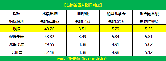 这里可以看出跟保塘的数据差别不大,喜欢甜度高,柔和度好的茶友可以尝试。但它这个甜度跟冰岛老寨的不一样,冰岛老寨还会有一种清凉感,应该是游离氨基酸造成的。