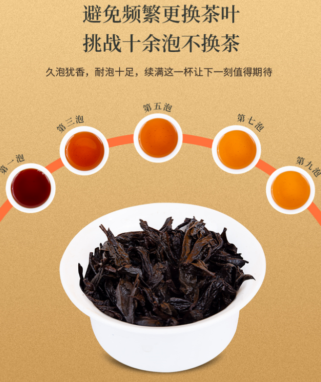 大红袍的浸泡时间:第二遍水的浸泡时间大概5-10秒,之后每泡可以延长5-10秒出汤,或者根据个人喜好来控制出汤时间,优质的大红袍可以冲泡八以上,余韵尚显,而且越泡越甘甜清澈。大红袍浸泡时间的调整原则为1至6泡的汤色基本一致。