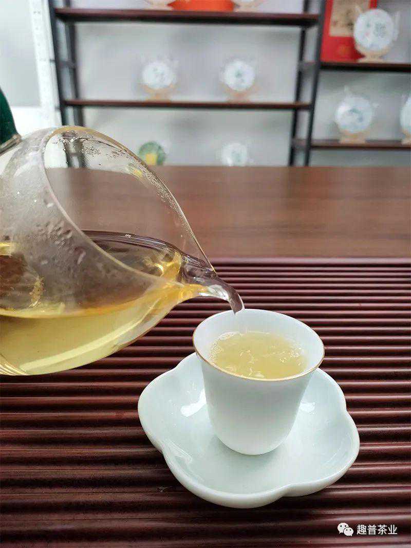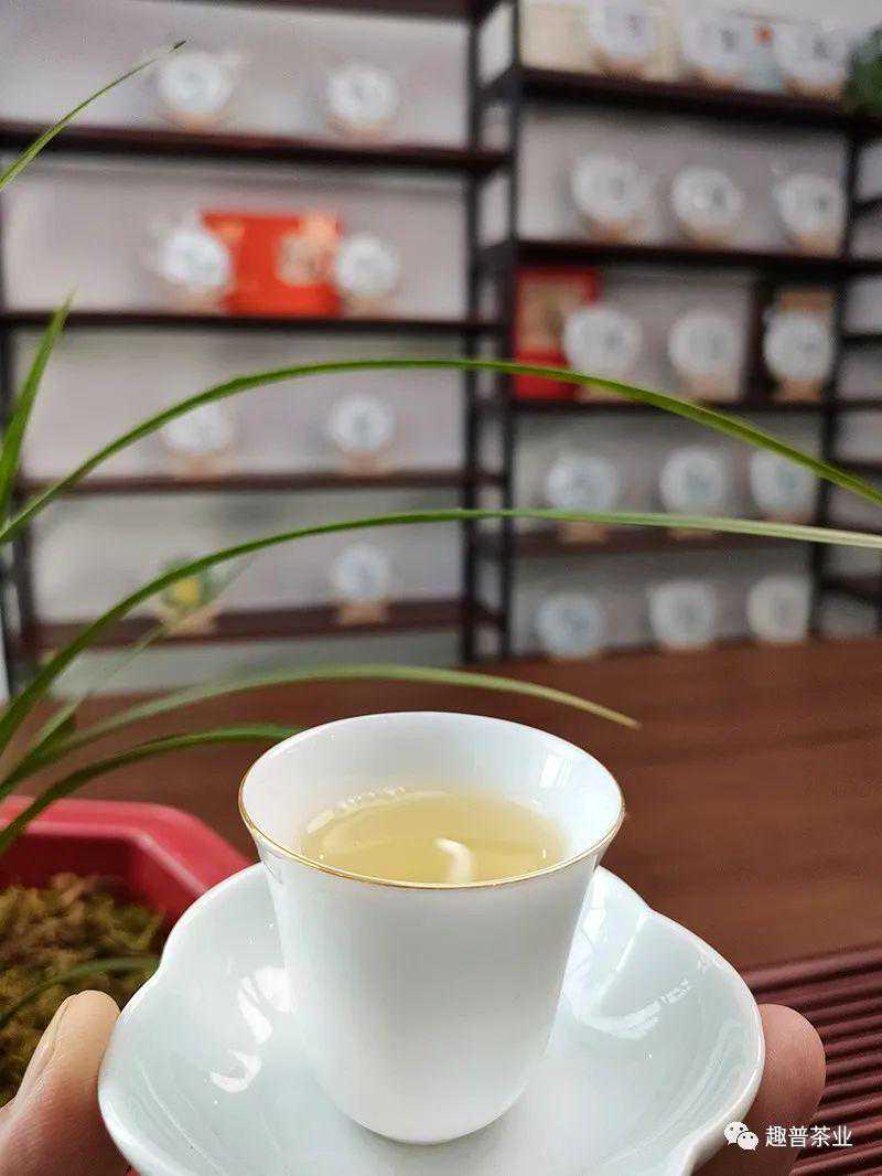 第3泡:甜润,茶汤呈黄绿色,略带青味,汤质饱满,香溶于水,微苦涩,化的快,回甘速度明显加快;