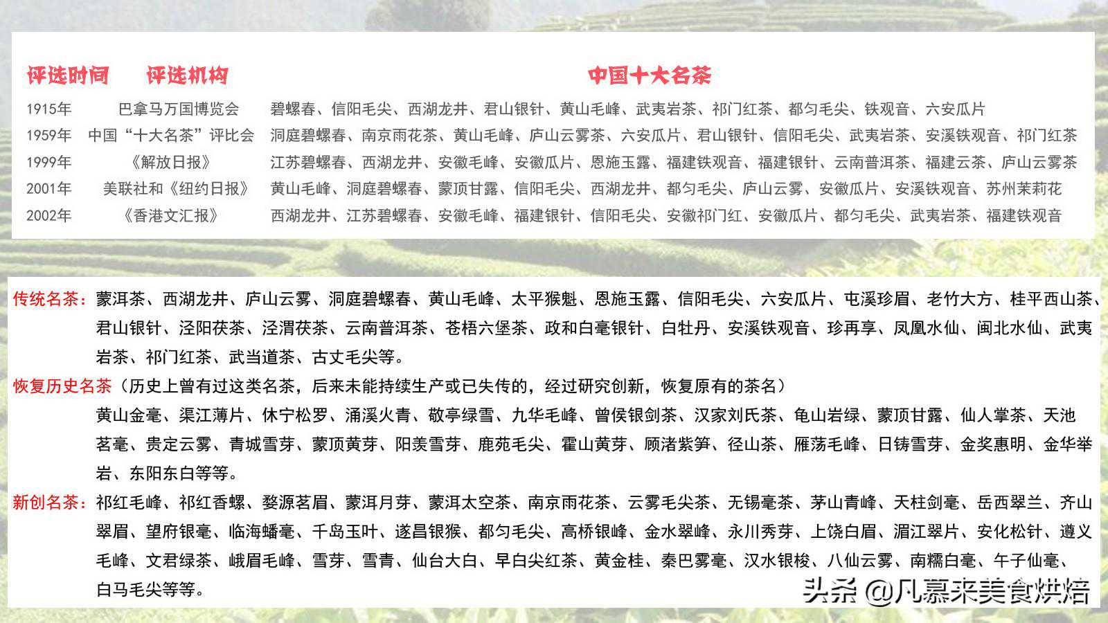 1915年巴拿马万国博览会将坦洋工夫、碧螺春、信阳毛尖、西湖龙井、君山银针、黄山毛峰、武夷岩茶、祁门红茶、都匀毛尖、六安瓜片列为中国十大名茶。