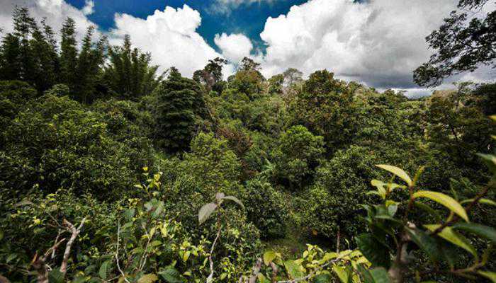 高大的古茶树大多散落在密林之中,有的古茶树之间甚至相隔几百米,与竹子、芭蕉、果树及各种叫不出名的花草树木混生。
