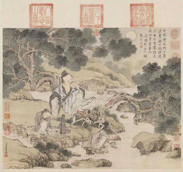 一些唐宋雅集绘画有这类描绘,比如《西园雅集图》、宋徽宗的《文会图》、文徵明《惠山茶会图》等等。可以在亭台楼阁中,也可以在山林溪泉边,有茶、有酒、有诗、有书、有画、有文人之间的这种交流。