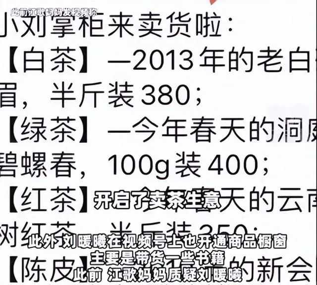 此前,江歌妈妈曾公开质疑刘暖曦利用江歌案的热度在粉丝群里卖茶叶。“刘暖曦又利用江歌被害事件积攒人气,开启了卖茶生意。”