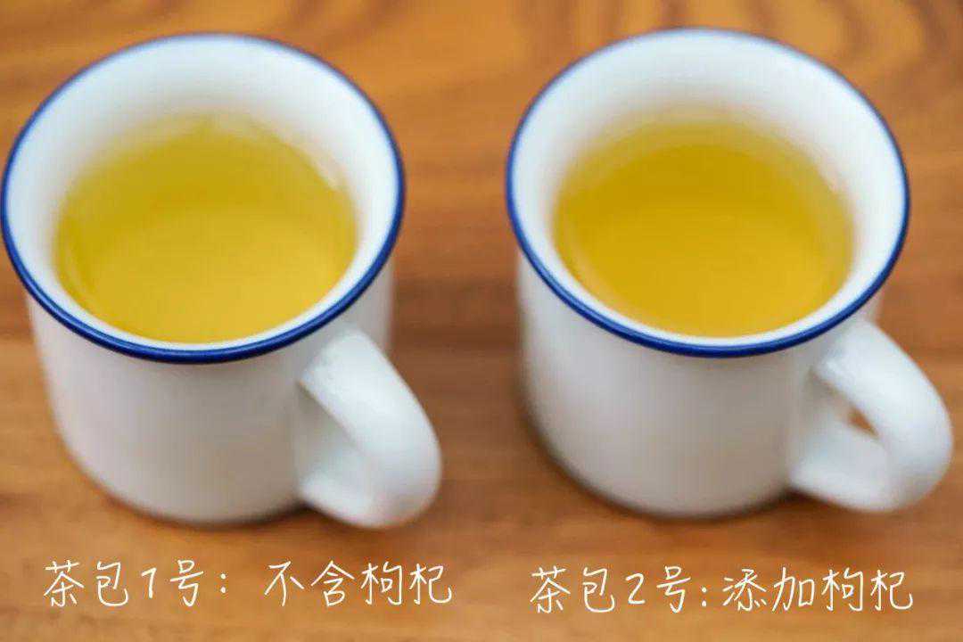 1号为同类产品茶包,2号茶包为饱记。1个茶包加200ml热水2分钟后,没有加枸杞的那一泡,颜色略淡,滋味也比较寡淡。