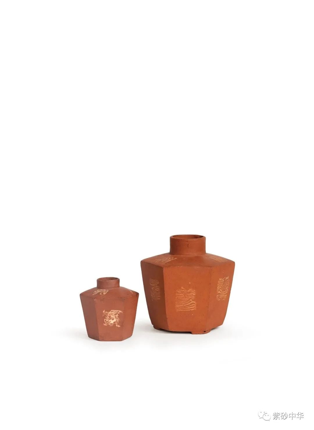 Lot7744清早期无款紫泥六方茶叶罐一组二件