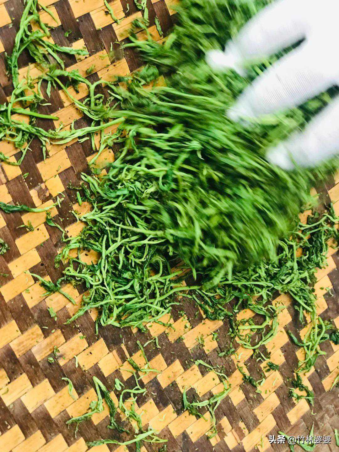 2摊青2小时到家里把茶叶摊青,这个过程,可以慢慢的看着它们笔直的身躯慢慢地柔软下来。叔叔说摊青如果做的不好的话,很容易在后期加工的过程当中成为废茶。