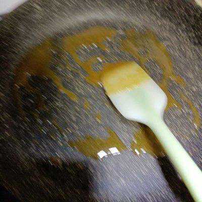 3、白砂糖用不沾的平底锅中小火炒出焦糖色后加入泡水后的茶叶一起小火炒一下,然后加入50克的开水到锅里煮至冒泡
