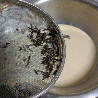 4、最后加入全脂的纯牛奶在锅里中小火煮开,喜欢茶味浓郁的可以多煮一会哟!边煮边用刮刀搅拌均匀。观察奶茶颜色稍微深一点了就可以过滤出锅了