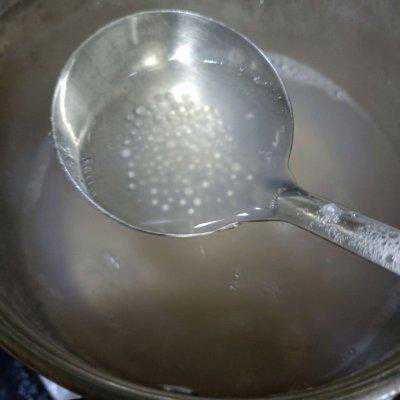 6、40克西米用奶锅煮十五分钟,看见中间只有一点点白心的时候就关火了,然后盖盖子焖五分钟后,白心就会全部消失的。用漏网过滤后再过一遍冰开水,放冰开水过一遍的目的是增加西米露的Q弹口感。