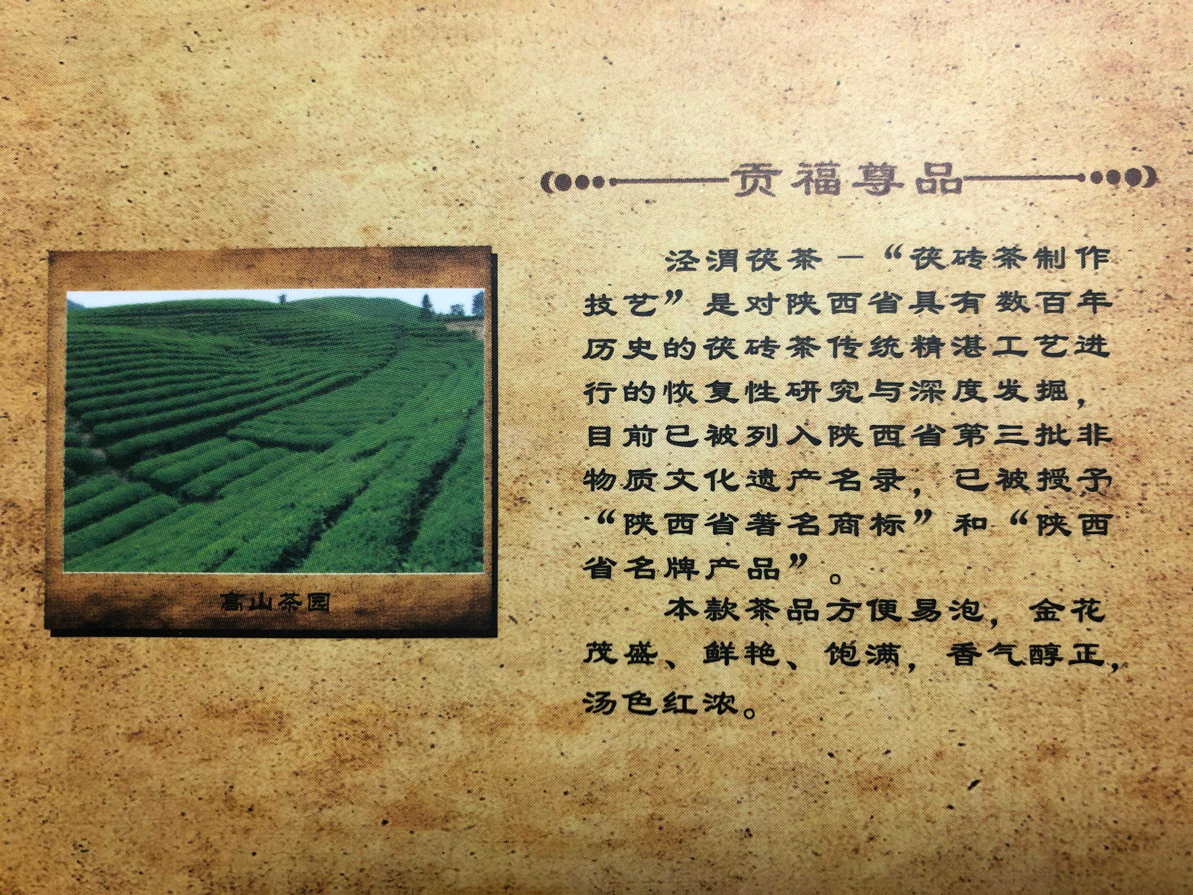 泾渭茯茶诞生于陕西咸阳,属于黑茶,是中国驰名商标,以恢复陕西省非物质文化遗产——茯砖茶制作技艺为业界著称,是陕西茯茶的领军品牌。
