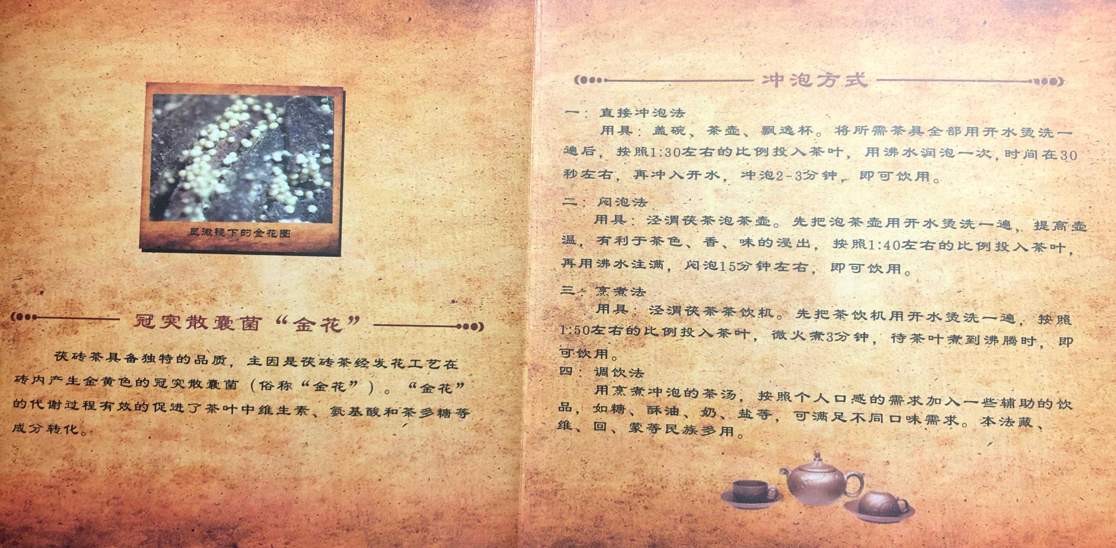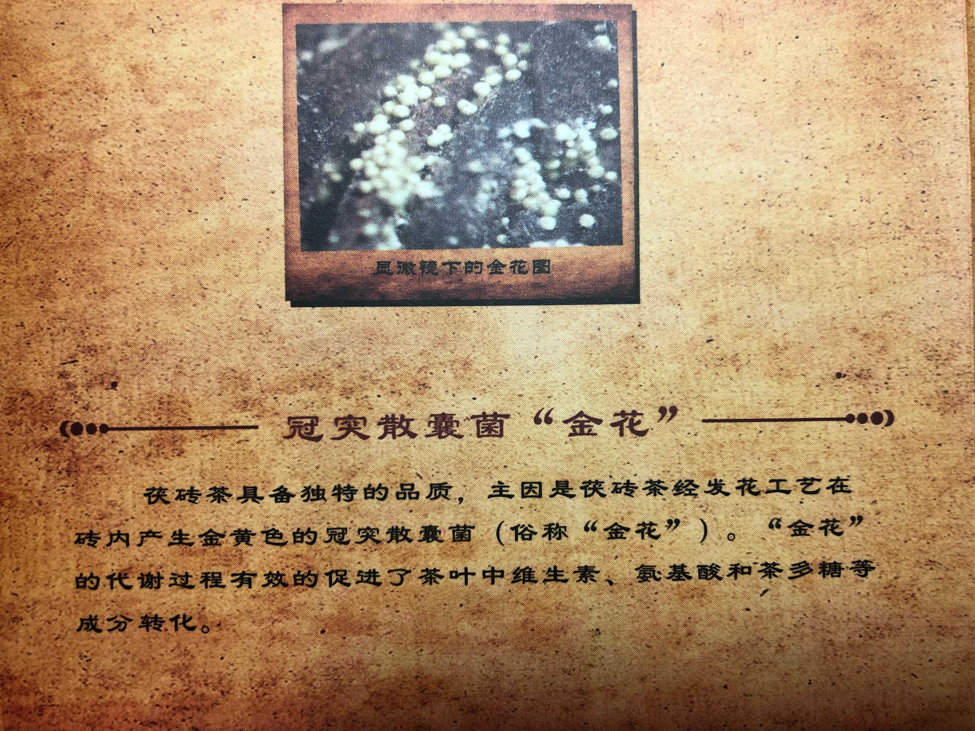 茶砖内部会自然生出一种小米一般的金黄色颗粒,俗称“金花”,学名:冠突散囊菌,有消脂解腻等功效,“金花”也成为评价茯茶品质的重要标准。经过一系列筑茶、发花等工艺,茯茶有了菌花香。