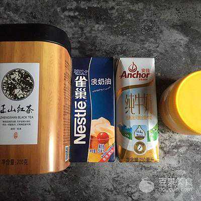 1、准备好材料,红茶、淡奶油、纯牛奶、蜂蜜