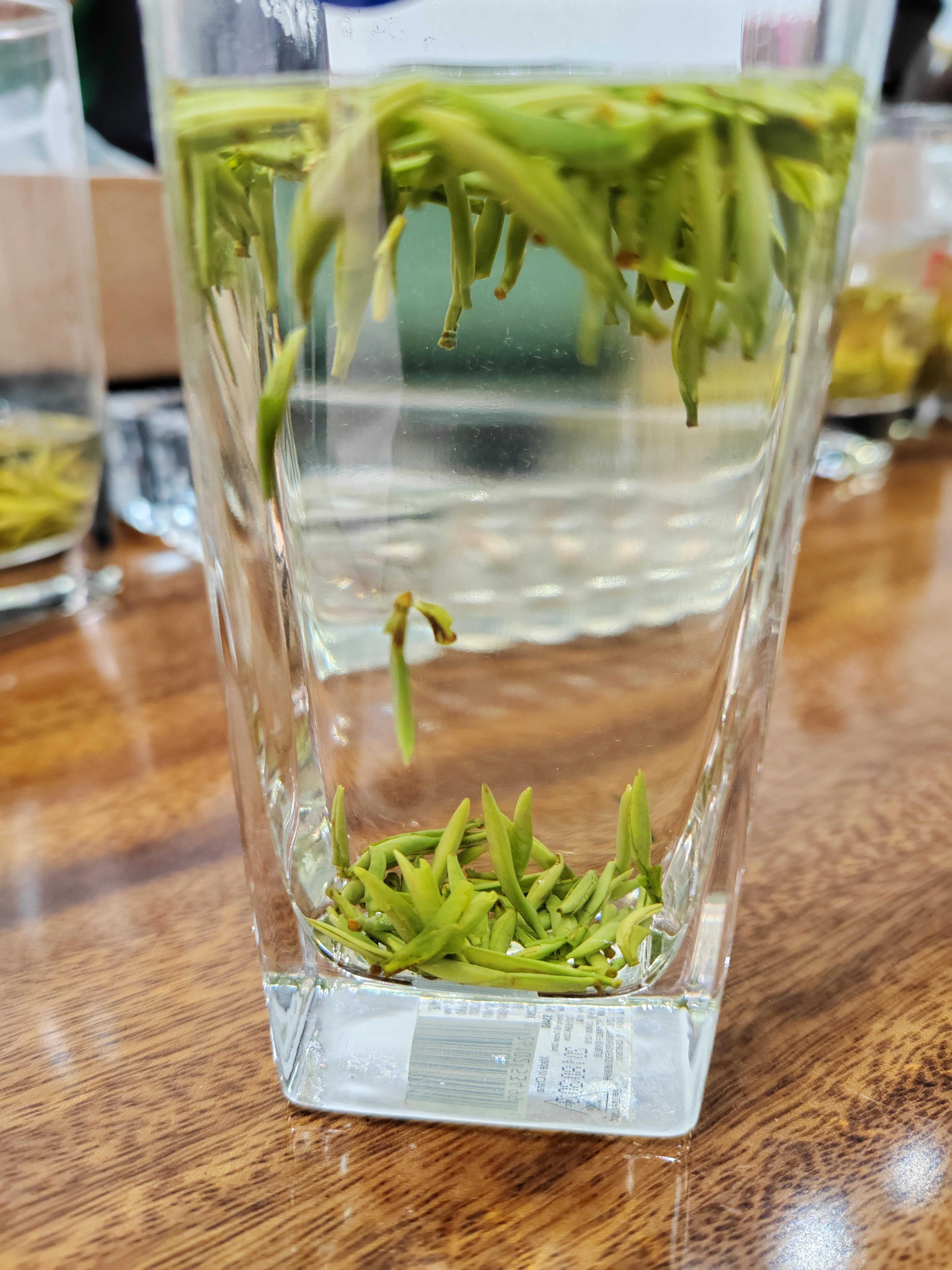 色:指竹叶青干茶外形和冲泡外形。竹叶青以纯芽头茶青原料,经杀青,理条,烘焙,压扁制作而成,干茶呈【直条,扁平,修长】型。冲泡开后,恢复“圆滚滚”茶芽型,并条条翠绿茶芽游走于茶汤,玻璃杯冲泡绝佳。