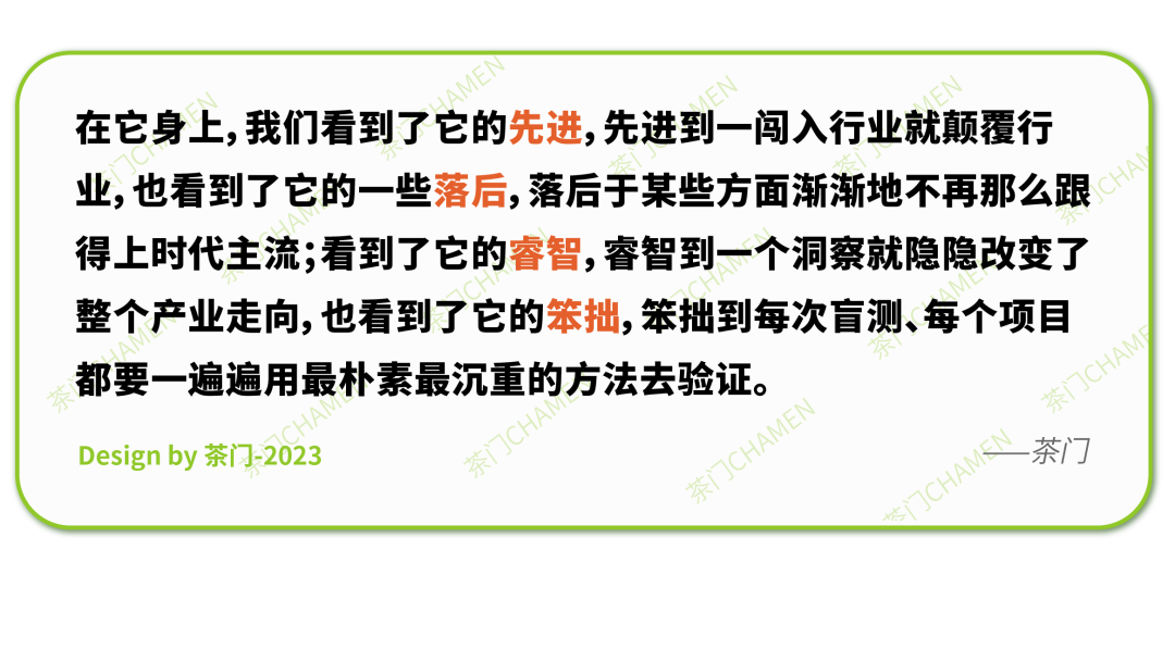 他是有移山之志的愚公,是时机未到尚不可为而仍要为之的逐日夸父,几乎凭一己之力推动茶业品牌化、工业化、标准化,推动茶叶从“农产品”逐渐向“工业品”的转变,用消费品的逻辑把茶叶再做一遍,给茶从业者非常多启发。冲这一腔热血,所有的茶人都应该向这位在茶业中始终坚挺前进的“孤勇者”致敬!