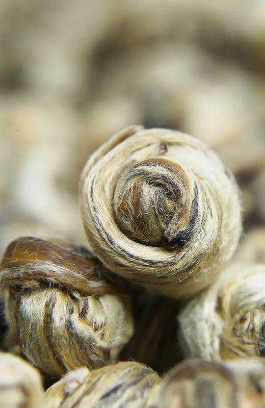 茉莉龙珠,因外形呈紧结饱满的颗粒状而得名。它肥嫩的单芽制成的烘青绿茶为坯,搓揉成珠,再与茉莉花拌合窨制。
