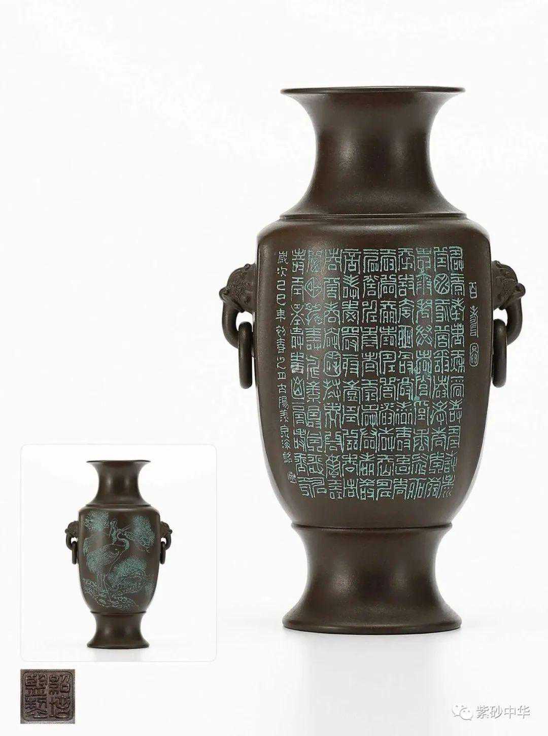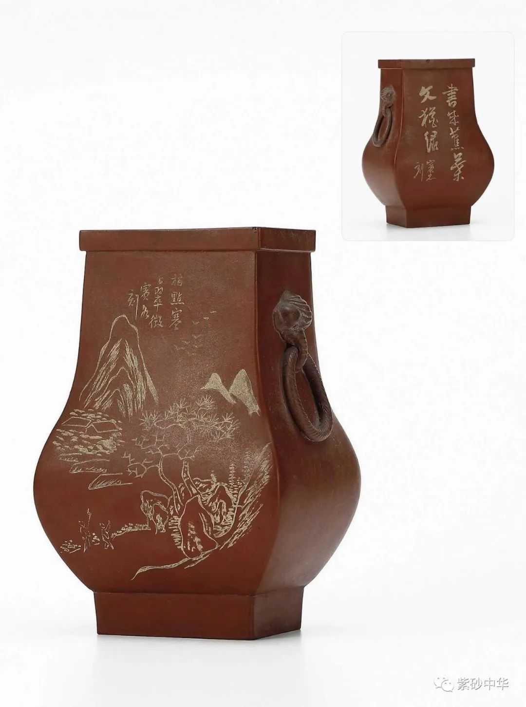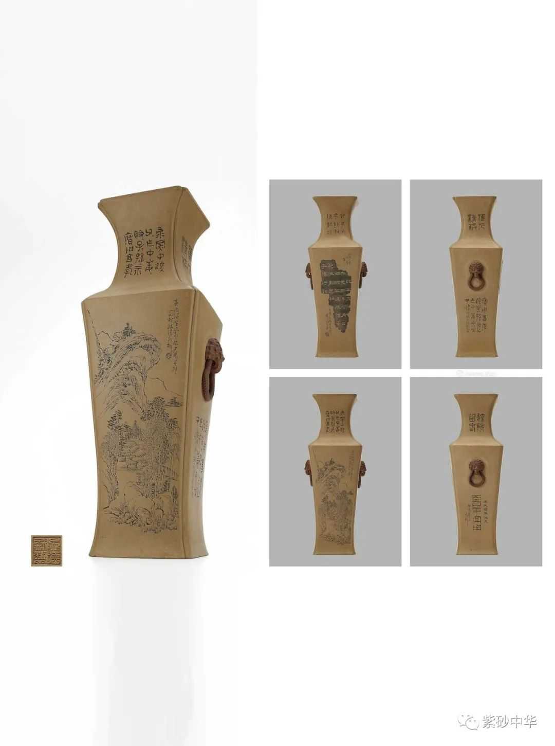 当代任淦庭刻紫泥粉浆出戟四方瓶