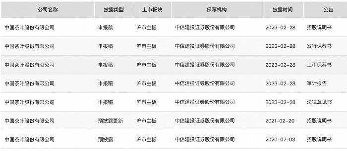 实际上,此前有心争夺A股“茶叶第一股”称号的可不只有澜沧古茶。中国茶叶早在2020年7月3日进行了预披露,2021年2月20日进行了预披露更新,目的地沪市主板,保荐人中信建投证券,后在2023年2月28日平移,2023年3月15日进入了问询环节。不过中国茶叶3月31日因财务资料过有效期而中止,6月30日公司提交了新的财务资料,恢复了进程。但截至目前,中国茶叶对第一轮问询并未有回复公告的披露。