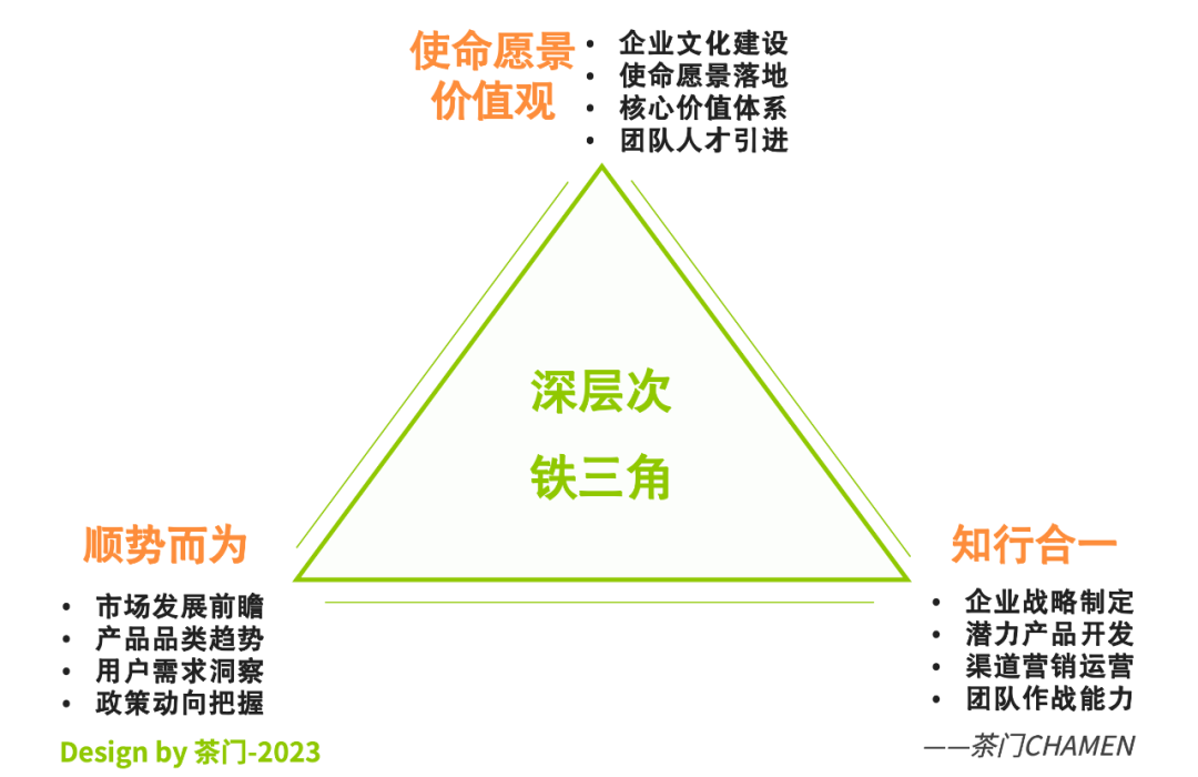 往深去说,第二个“铁三角”,则可以拔高到有点形而上层面的“使命愿景价值观+顺势而为+知行合一”。要飞得够高、够远、够久,那就既得趋势脉搏把握、战略眼光独到,还要一点使命愿景价值观凝聚一个能干事的团队,行动及时、攻城拔寨,更别说拖后腿。