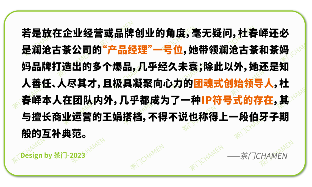 此外,对于澜沧古茶这个从云南深山走出来、如今还幸运登上“内地茶企第一股”的普洱茶品牌,其成绩绝非仅仅依靠自身的励精图治这么简单,更重要还在于,在杜春峄领衔下的澜沧古茶,敢于不拘一格招揽人才并放权给比如王娟此等商业型精英,而后与杜春峄这位以制茶技术见长的“产品经理”型创始人完成互补,组成一个更加全能的核心管理团队。