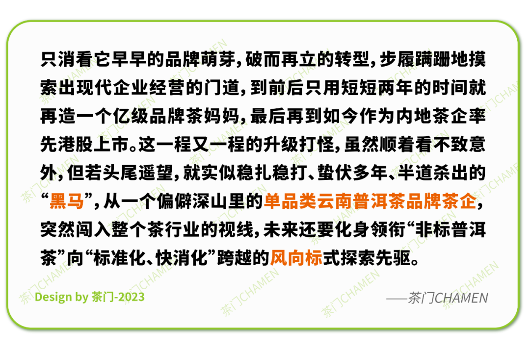 从现在的时间节点回望,作为一个萌芽于云南偏僻深山的传统茶企,能够在数次历史浪潮中站稳脚跟,荣登如今的“中国普洱茶IPO第一股”,则不得不感叹其在起盘之路上朴素的品牌直觉,与对时代脉搏的牢牢把握。