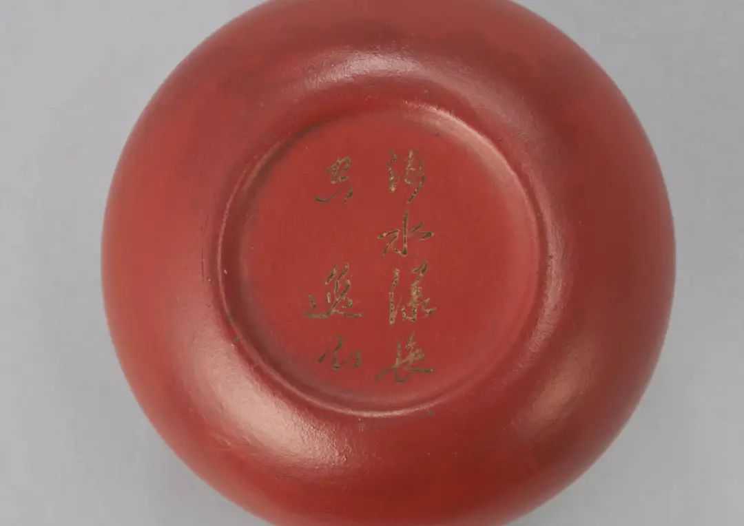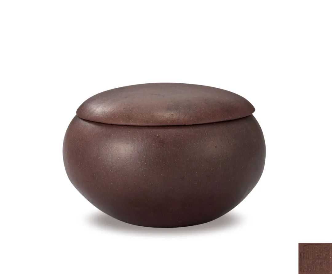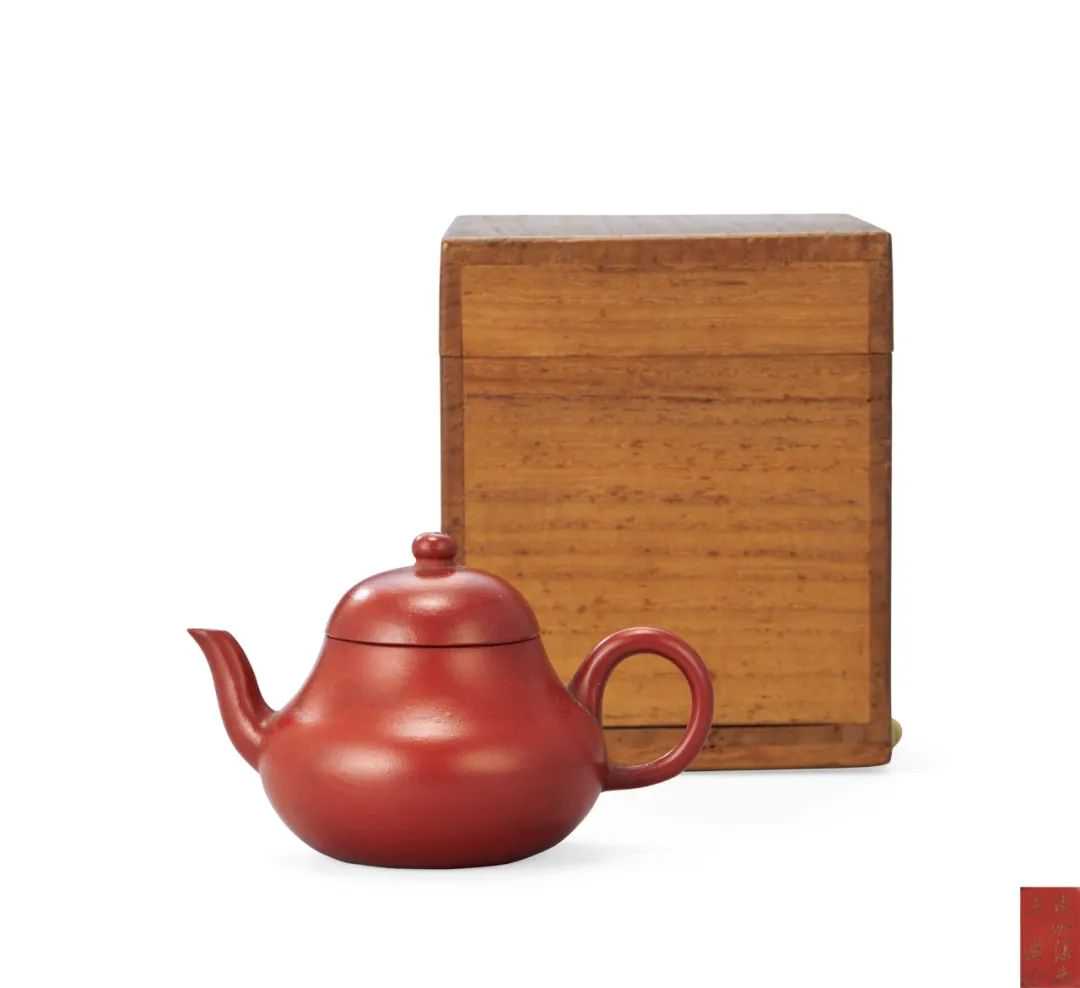 此件紫砂壺呈絳紅色,以紫沙調泥打身筒,壺質潤厚如玉,壺體造型圓潤,拱狀圓蓋,上配圓扁壺鈕,與壺身呼應,口蓋緊密。短流向上微微胥出,壺身、壺把、壺嘴調度恰到好處,線條貫通流暢,氣韻不凡。底款印「大清乾隆年制」六字篆書款。此件紫砂壺工藝精練,祥瑞討喜,富麗大氣,為宮廷制器之佳品。日本昭和時期的繪畫家渡辺崋山為其書寫箱書。