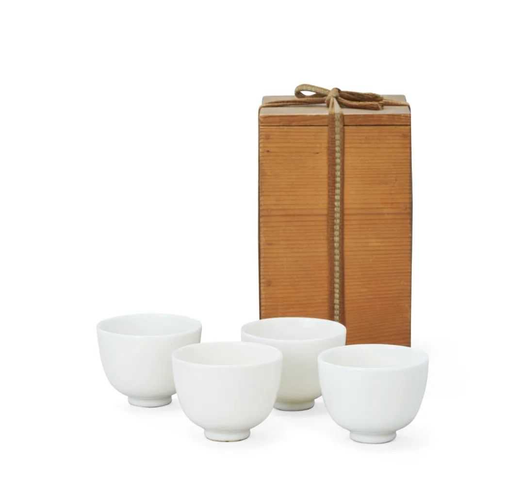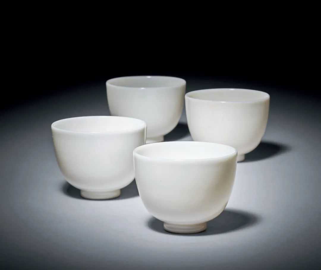 德化杯一組四客,胎質細白,通體施白釉,釉面光潔瑩亮,滑膩乳白,溫潤如玉,宛似象牙,胎體緻密,透光度特別良好,在日光或燈光照耀下可映見指影。釉水的質地堅韌瑩潤,這是德化白瓷聞名於世的特徵。明代晚期至清代前期是德化窯「中國白」瓷器突然崛起,全面成熟的時代,其胎釉及器物形制出神入化,其中的杯形製品多樣,多為飲酒品茶之器,深受國內外喜愛,文人墨客也多有題詩題字於其上,增添了幾分風雅之趣。