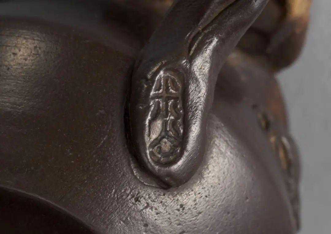 “砂張銅”是日本江戶時代的一種特殊銅器。所謂「砂張」是指在銅器上用沙子磨砂,然後再施以某種酸蝕處理,使其呈現獨特的質感和紋理。這種工藝使銅器表面產生類似青銅的氧化皮膜,顏色帶有翠綠、藍黑等多樣的色調,給人一種古樸、自然的感覺。本件砂張銅蟹亀雕壺名為「五月雨」,壺身上有雕刻荷花與螃蟹,十分生動活潑。梯梁的造型也極為獨特少見。本件作品來源清晰,有紙本記錄其作為芭蕉翁的舊藏出展記錄。