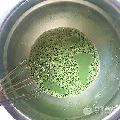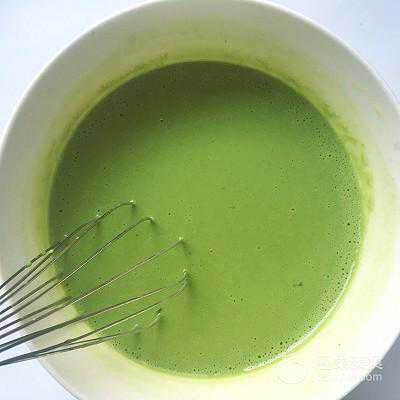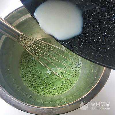 18、将热牛奶一点点倒入抹茶糊中,之后用蛋抽搅拌均匀