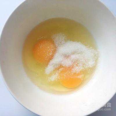 5、鸡蛋加细砂糖,用蛋抽搅拌至细砂糖融化,看不到砂糖颗粒