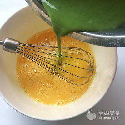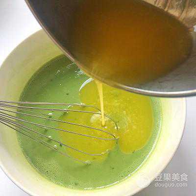 19、将搅拌好的抹茶糊倒入蛋黄中搅拌均匀