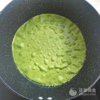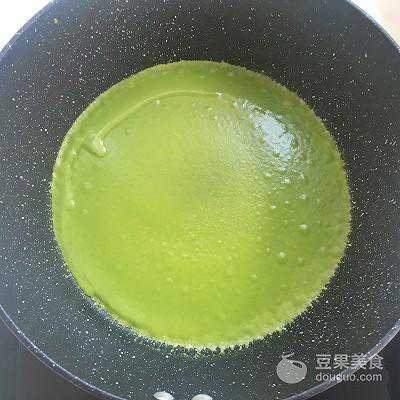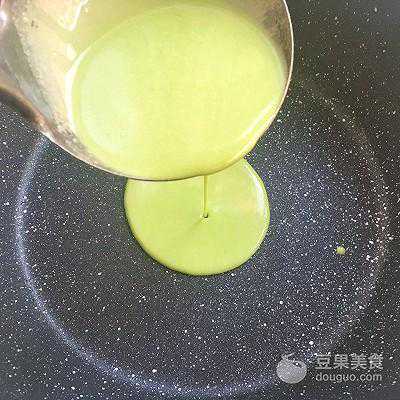11、用勺子舀上一勺面糊,倒入不粘锅内,之后转动不粘锅,让面糊均匀的铺满锅底,面糊不要过多,薄薄一层即可