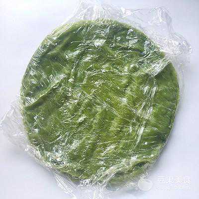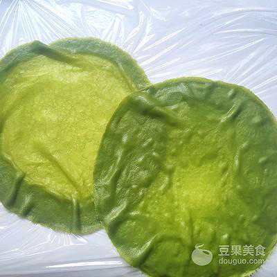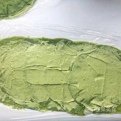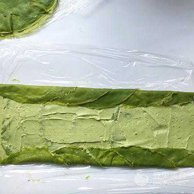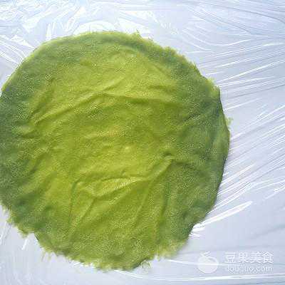 29、面皮底下铺上油纸或保鲜膜,取一张抹茶面皮铺上